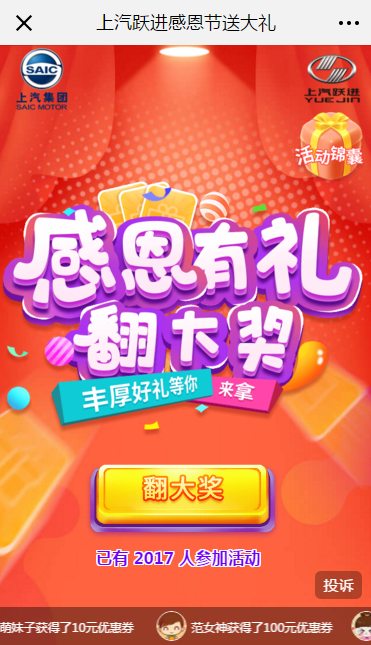 参与方式:(跃进订阅号)也可以在公众号功能菜单选择“跃·精彩”进入“感恩节送大奖”页面。(跃进服务号)也可以在公众号功能菜单选择“产品中心”进入“感恩节送大奖”页面。(卡家微信)也可以在公众号功能菜单选择“卡车配件”进入“感恩有礼”页面。