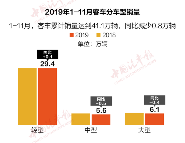 1-11月,南京依维柯累计销售依维柯品牌欧系轻客23270辆,同比下降18.40%。在大中型客车领域,上海申沃客车11月份销车163辆,同比增长87.36%;1-11月累计销售客车1085辆,同比增长34.28%。