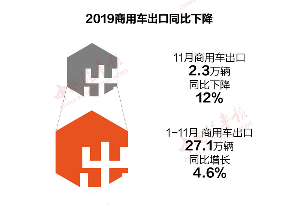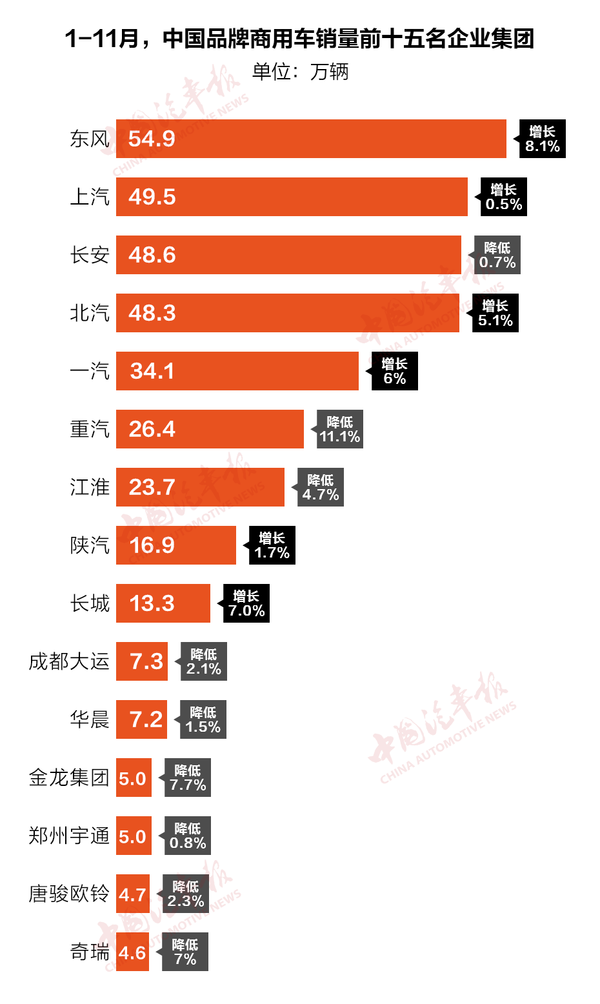 以上汽为例,1-11月,上汽红岩重卡累计销量52671辆,同比下降2.89%。1-11月,上汽大通累计销售各类车型133168辆(含跃进轻卡),同比增长17.93%。