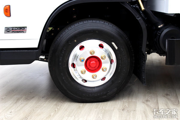 轮胎采用朝阳长征品牌,型号为7.50R16,车轮为非常耀眼的铝合金轮圈。跟据这款车的发动机转速、变速箱最高挡速比、后桥速比和轮胎型号,我们通过卡车之家车速计算器能得出,它在1400-1600转的经济转速区间内,车速可达61-70km/h,符合城市运输配送的需求。