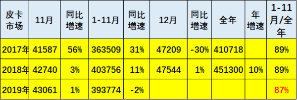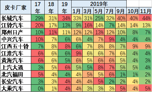 2019年1~11月份皮卡累计销量39万台,累积同比下降2%。今年皮卡相对于传统轻卡的表现较强,但国六影响较大。