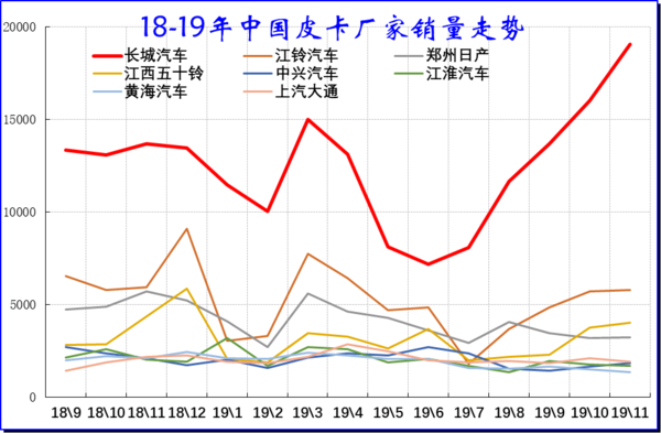 在2018年正增长基础上,2019年1-4月的皮卡市场走势相对较强,5-9月稍有回落调整。10-11月大幅走强。