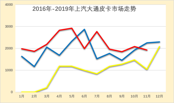 上汽大通的皮卡市场持续走强,2017年持续拉升,2018年平稳走强,尤其是2019年在市场下行压力下,上汽大通表现较强。