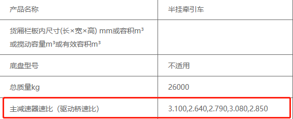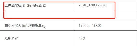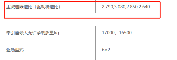而在6X2车型上,我们就看到了选择范围更为宽泛的速比,分别为:3.1、2.64、2.79、3.08、2.85,速比选择更多,兼顾动力性以及时效性,适应工况更加宽泛。
