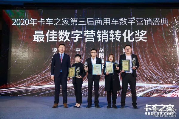 【卡车之家 原创】2020年1月15日,由卡车之家主办,主题为”数字赋能渠道 智启营销转化“的2020年卡车之家第三届商用车数字营销盛典在济南举行。根据卡车之家数字营销中心多项数据,遵义铭汇齐宇汽车贸易有限公司、中山市顺景汽车贸易有限公司、岳阳福旺汽车销售服务有限公司、徐州朗驰汽车销售服务有限公司等四家获得了最佳数字营销转化奖。