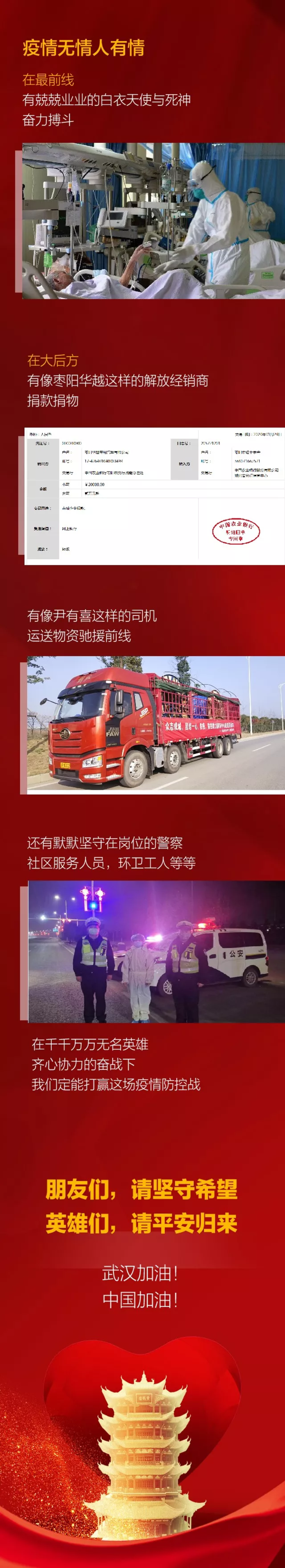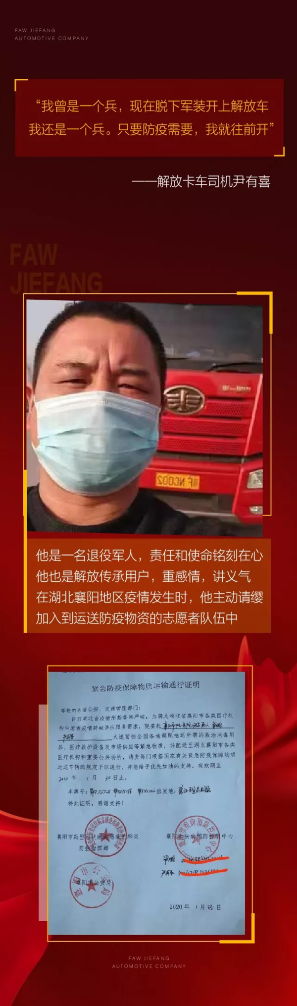 抗击疫情 解放经销商捐款捐物 解放卡友主动请缨运送物资kayou_22281462020-02-02+ 关注及时了解武汉新型冠状病毒对货运行业的影响,请随时关注卡车之家专题报道→→抗击疫情,卡车人奋战在前线←←免责声明:本文来自卡车之家卡家号自媒体,不代表卡车之家的观点和立场。未经允许,禁止转载。加入我们,用你的优质内容,为自己发声,为行业代言,成为商用车圈儿的意见领袖.武汉疫情 企业动向 行业动态