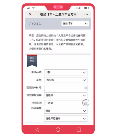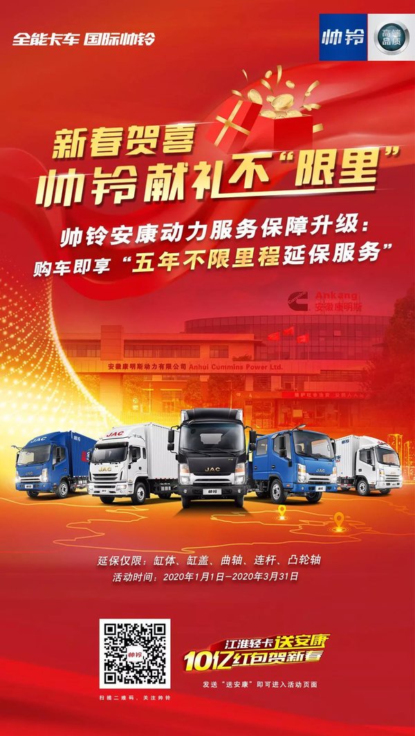 当你确定车型配置以后,想要买车就变得更简单了。大家可以通过江淮汽车官方网站在线订车,据官方介绍预交100元定金可享1000元购车优惠。其中购买帅铃安康动力车型,还有5年不限里程延保服务保障。