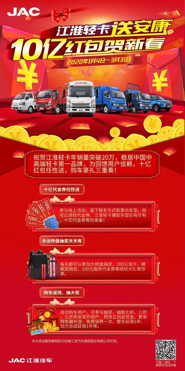 【卡车之家 原创】按照正常情况下,商用车行业年后是个购车旺季,但今年的情况,由于武汉的疫情...变得有些特殊,工厂、4S店受到延迟开工等影响,很多人不敢出门,那么买车看车似乎变得有些艰难。但值得庆幸的是,江淮汽车针对特殊情况推出“一站式服务、全方位护航”的线上购车活动,一部手机就能轻松搞定看车、选车、购车、送车上门等一站式服务,360°全方位护航,保你36°安全度过危险疫情!