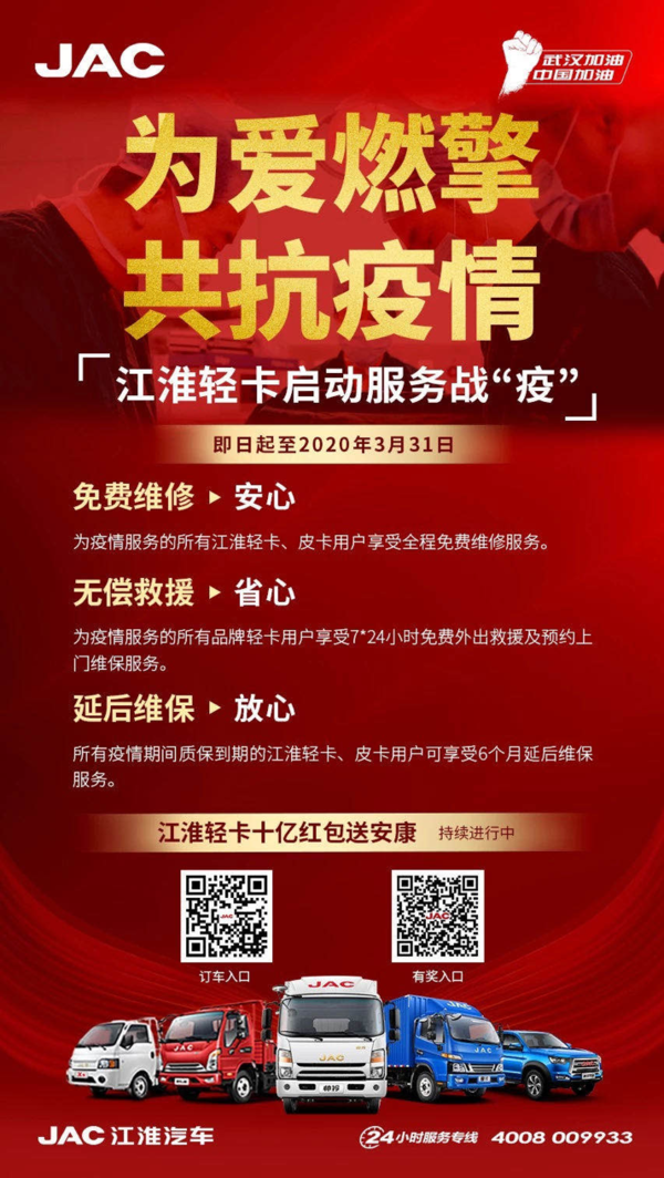 江淮轻卡服务战疫政策为疫情服务的所有品牌轻卡用户享受7*24小时免费外出救援及预约上门维保服务。