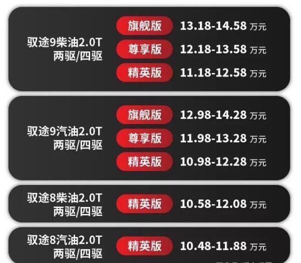 在消费升级以及市场需求多元化的大环境下,福田拓陆者驭途、胜途两大系列产品,共计22款车型,均支持国六B排放。售价方面,基于全新P3平台打造的驭途9售价区间为10.98-14.58万元,驭途8售价区间为10.48-12.08万元。