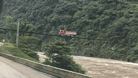 大货车过吊桥,桥下就是波涛滚滚的河面
