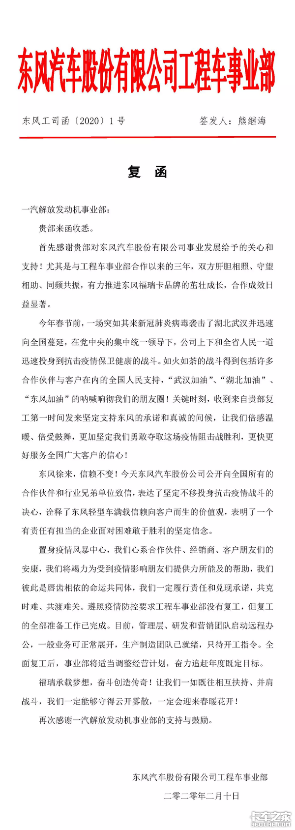 当日,东风汽车股份有限公司工程车事业部做了复函,复函中对一汽解放发动机事业部的关心和支持表示感谢,并表示:“置身风暴中心,我们将心系合作伙伴、经销商、客户朋友们的安康,我们将竭力为受到疫情影响的朋友们提供力所能及的帮助,我们彼此是唇齿相依的命运共同体,我们一定履行责任和兑现承诺,共克时艰,共度难关。”
