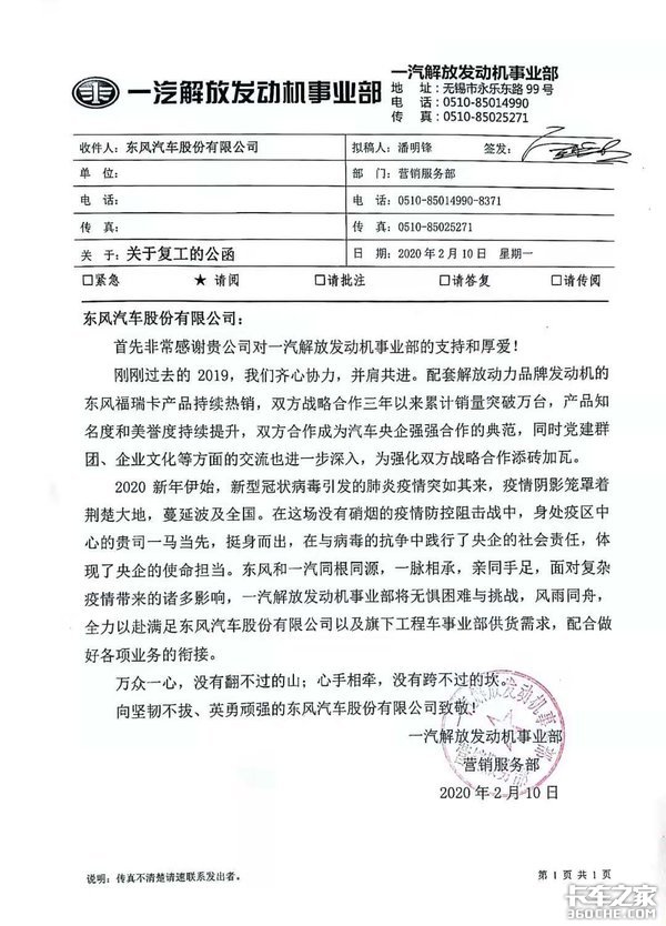 2月10日,一汽解放发动机事业部发出了致东风汽车股份有限公司的传真函,文件中对东风所处的灾难表示感同身受,为东风在疫情中体现的社会责任点赞,并承诺:“一汽解放发动机事业部将无惧困难与挑战,风雨同舟,全力以赴满足东风汽车股份有限公司以及旗下事业部供货需求,配合做好各项业务的衔接。”