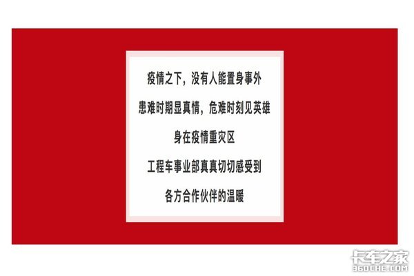 在疫情防控最艰难、最重要的时刻,工程车事业部衷心感谢昆明云内动力的肝胆相照和守望相助,让我们获得多一份战胜疫情的力量。工程车事业部坚信,有昆明云内动力的勠力同心,我们一定能打赢这场没有硝烟的战争,为更多朴实的奋斗者送福献瑞!