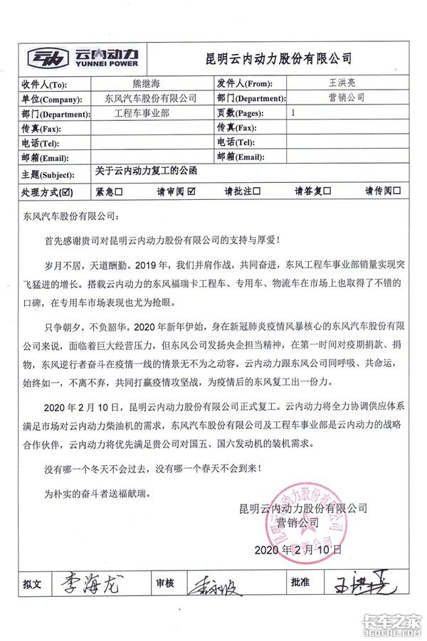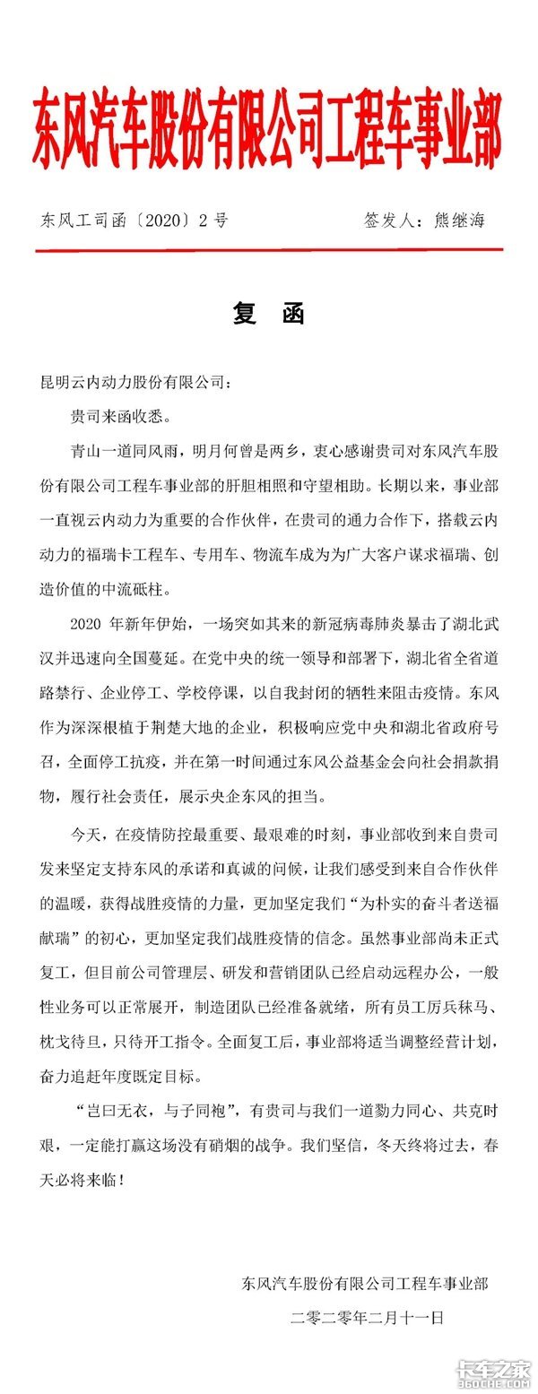 2月10日,工程车事业部收到了来自昆明云内动力股份有限公司(以下简称“昆明云内动力”)的复工函。作为最重要的战略合作伙伴之一,昆明云内动力表示将全力协调供应体系,优先满足东风福瑞卡对国五、国六的装机需求,满足市场对云内动力柴油机的需求。