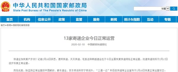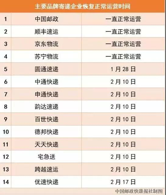 昨天,国家邮政局官网发布通知,截至目前,已有中国邮政、顺丰速运、京东物流、苏宁物流、圆通速递、申通快递、中通快递、韵达快递、百世快递、德邦快递、天天快递、宅急送、跨越速运等13家寄递企业由“春节模式”进入到正常运营状态。