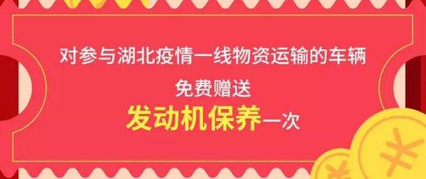 对参与湖北疫情一线物资运输的车辆免费赠送发动机保养一次。