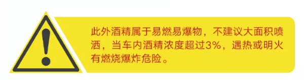 但是使用酒精消毒时,只可以擦拭,不可以喷洒用于空气消毒!酒精消毒必须擦拭,不可喷洒!不可喷洒!不可喷洒!75%酒精的闪点是22℃,在喷洒浓度达到3%的情况下,毛衣与汽车座椅摩擦的静电即可燃爆!更不可喷洒酒精后在车内抽烟!禁止对在用电环境下进行酒精消毒。车内消毒后要进行规范的通风操作。为避免起火危险,请将消毒剂或酒精放置在不受光热影响的区域内。