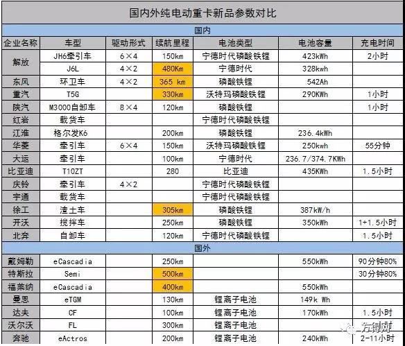 方得网对已曝光的国内外纯电动重卡车型数据做了盘点,请看上表。