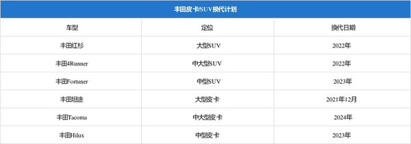 近日,有海外媒体曝光了丰田在美国市场未来产品计划,其中包括了多款皮卡以及SUV。