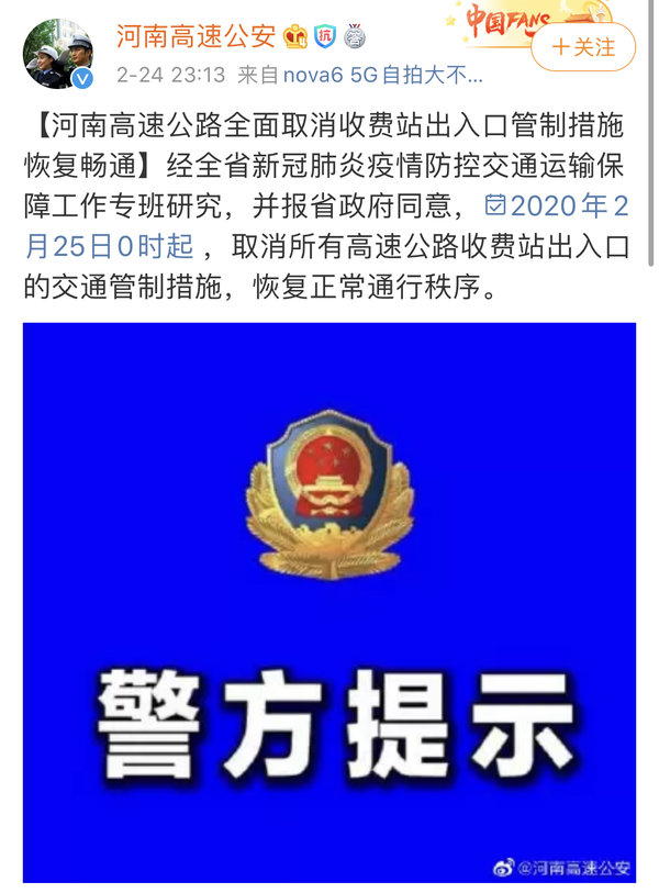 2月24日晚,河南高速公安官方微博发布消息:经全省新冠肺炎疫情防控交通运输保障工作专班研究,并报省政府同意,2020年2月25日0时起,取消所有高速公路收费站出入口的交通管制措施,恢复正常通行秩序。