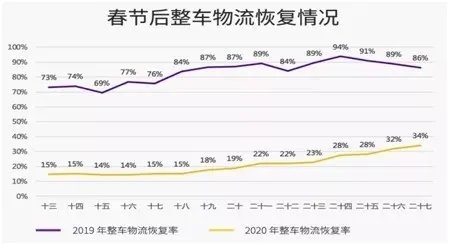 根据G7发布的数据,2020年春节后整车物流的恢复率只恢复到了年前常规时间的2成左右,而去年同期这已经恢复到了8-9成。可见公路整车资源非常简章。