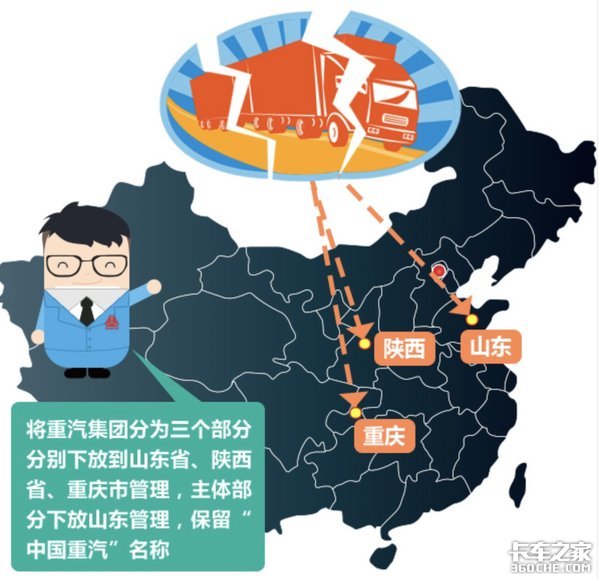 重汽集团分为三个部分,分别下放到山东省、陕西省、重庆市管理,也就是斯太尔体系的三家重卡整车企业:中国重型汽车集团有限公司、陕西汽车集团有限公司、重庆重型汽车有限公司。