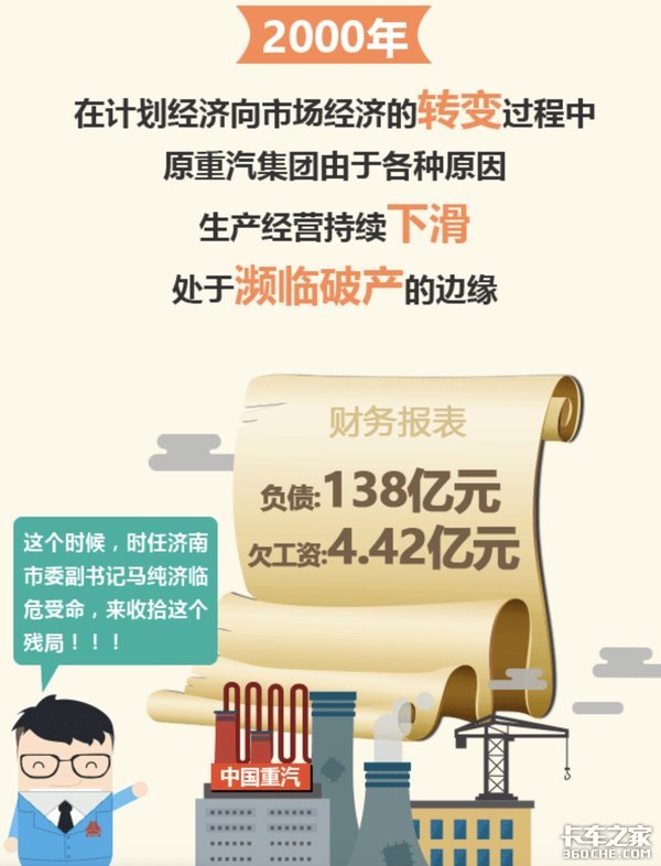 上世纪90年代末,受当时的收费政策等影响,重汽集团生产的车型并不占据优势,从1995年到2000年短短五年时间便从鼎盛走到了破产边缘。古人有云,天下大势分久必合,合久必分。面临破产危机,2000年中国重型集团公司正式拆分。