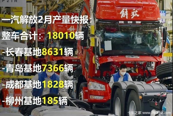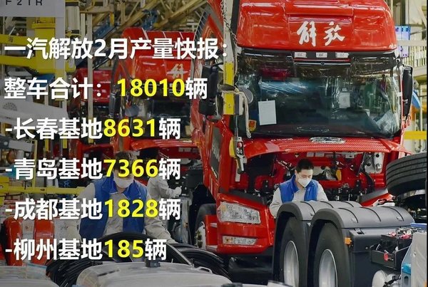 3月1日,记者从制造物流部获悉:2月份,一汽解放共生产整车18010辆,其中,长春基地8631辆、青岛基地7366辆,成都基地1828辆、柳州基地185辆。
