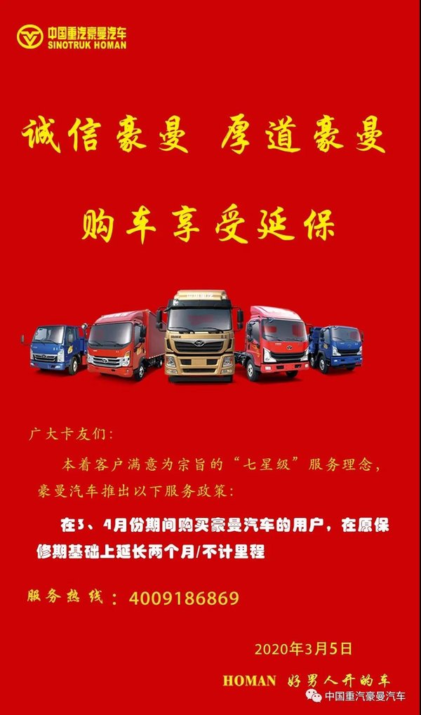 在3、4月份期间购买豪曼汽车的用户,在原保修期基础上延长两个月/不计里程。