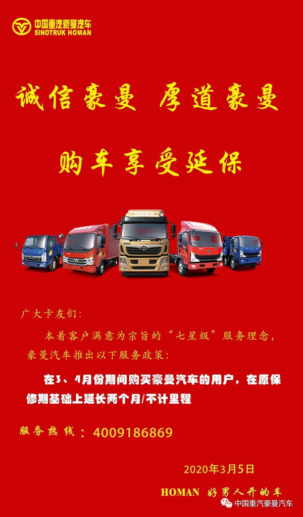 【卡车之家 原创】为支持行业复工复产、保障广大客户的基本利益,及助力全国人民打赢这场防疫攻坚战,豪曼汽车本着客户满意为宗旨的“七星级”服务理念,特别推出以下服务政策: