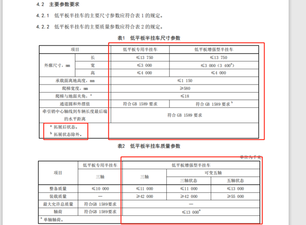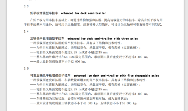 而新《规范》的重点内容,主要是增加了“低平板增强型半挂车”这一新品类及其技术要求、试验方法,并且将其划分成了三轴低平板增强型半挂车、可变五轴低平板增强型半挂车两种。