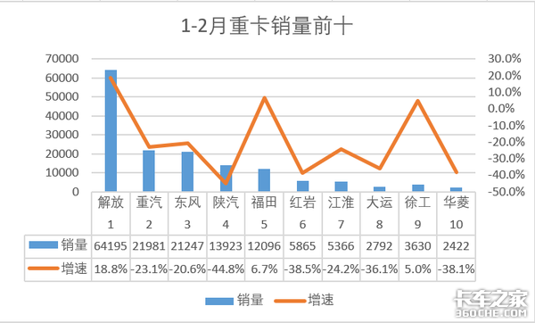 【卡车之家 原创】近日,2月重卡销量排名前十出炉。由于疫情影响,当月重卡销量3.8万辆,同比下降51.9%。从卡车各大细分市场来看,重卡表现相对较好。
