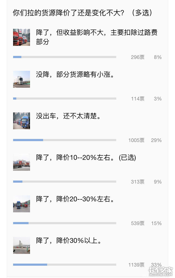根据卡车之家公布的调查问卷显示:超过半数的卡友在调查问卷中表明现在运费不增反降,更甚者已经有运费下降超过30%的现象发生,