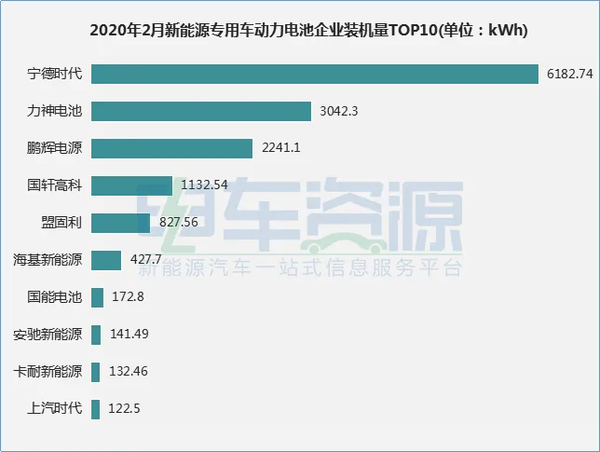 从电池厂商方面看,2月为新能源专用车提供电池配套的企业仅16家,比1月份减少11家。其中,宁德时代以6.18MWh的装机量获得冠军的宝座;力神电池以3.04MWh的装机量位居第二;排名第三的是鹏辉电源,装机量为2.24MWh;此次,国轩高科在专用车领域首次掉出前三名,装机量仅1.13MWh,排名第四;紧随其后的盟固利,装机量为0.83MWh。