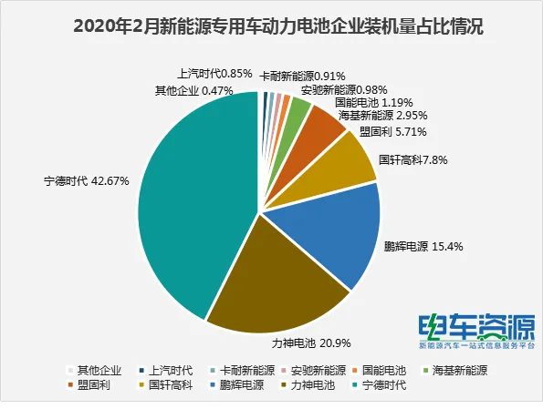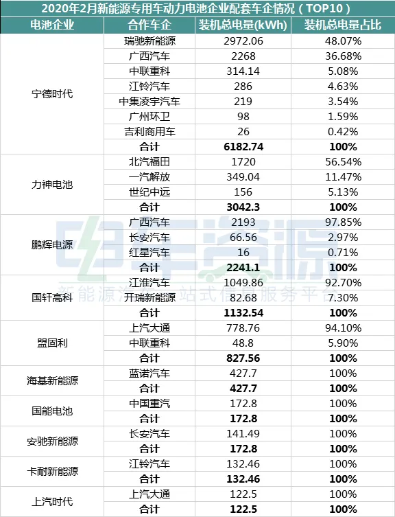 从上文的图表中可以看出,2020年2月,宁德时代依旧是配套车企数量最多的企业,配套7家车企,其中装机量最多的是瑞驰新能源,装机总电量为2.97MWh,占比48.07%。