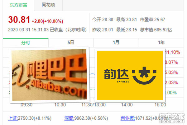 据悉,韵达被阿里注资的消息一出,韵达股份股票立马上涨,截止目前韵达涨10%报30.81元,封上涨停板。但针对该消息,阿里巴巴集团方面回应称:“对市场传闻不予置评”。