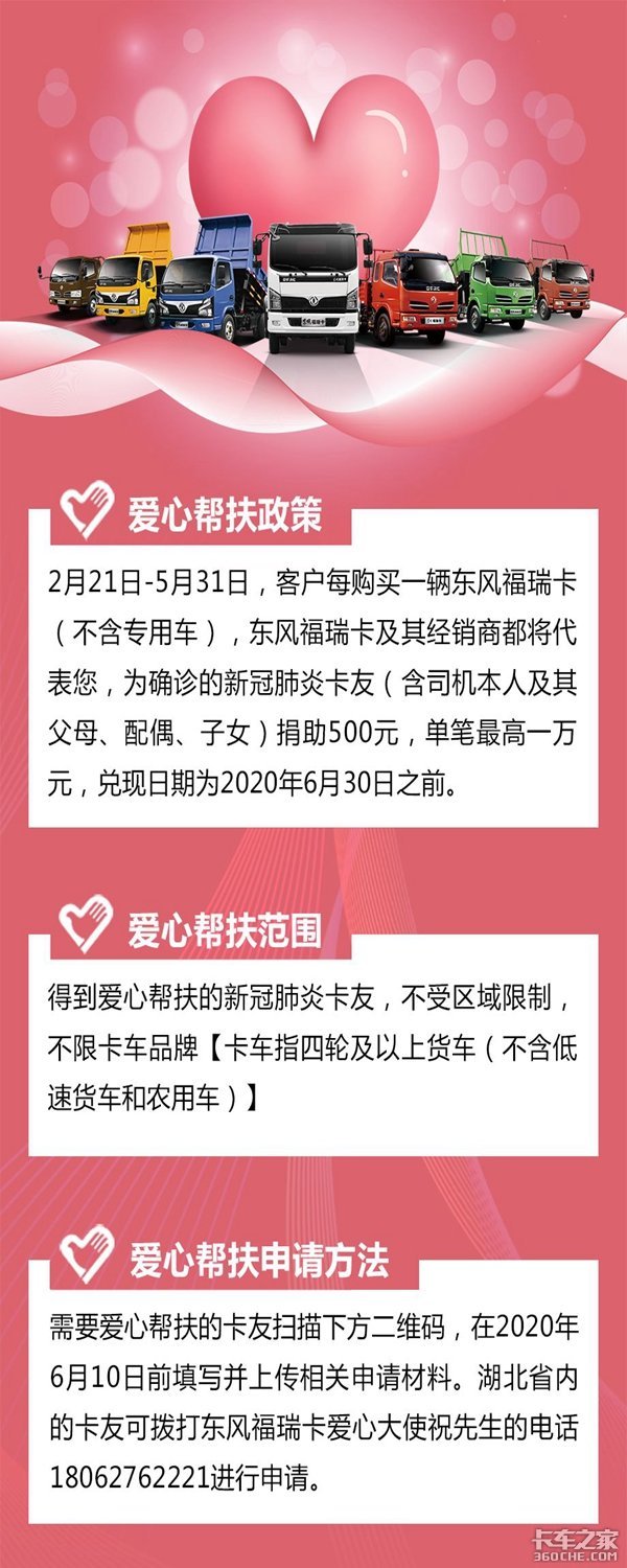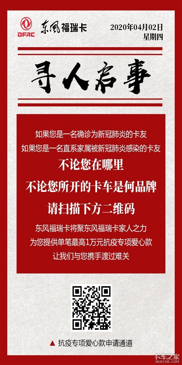 春生万象,一切都在复苏,在中国新冠肺炎疫情也取得了阶段性胜利,但疫情仍未退,许多人的生活因此发生了不可逆的改变,尤其是确诊的患者及其家属。对此,东风福瑞卡始终坚持为朴实的奋斗者送福献瑞的品牌主张,于2月21日开展了一场抗击疫情的公益活动,不限地域,不限品牌,为全国确诊的新冠肺炎卡车司机及其直系亲属提供“东风轻型车抗疫专项爱心款”。