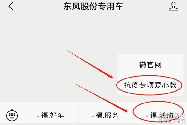 方法二:进入“东风股份专用车”微信公众号,点击菜单栏【福·活动】-【抗疫专项爱心款】。