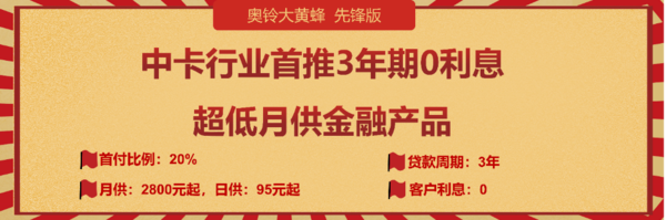 “赚钱0压力,购车做先锋”,奥铃大黄蜂先锋版包括福田康明斯ISF4.5、云内德威D45两款动力车型的排半及高顶双卧等4款产品。基于奥铃大黄蜂轻量化设计,奥铃大黄蜂先锋版为不同经济条件的客户定制“低首付·0利息·0担保”的多样化金融购车方案。客户选购云内德威D45动力奥铃大黄蜂产品,即可享受3成首付提车待遇,仅需最低43000元首付便可拥有最美中卡,同时厂家贴息20000元,相当于3年0利息,月供更是低至2800元起。客户选购福田康明斯ISF4.5动力奥铃大黄蜂产品即可享受2成首付提车待遇,仅需31000元首付即可,同时厂家贴息22000元,月供低至3500元起,拥有奥铃大黄蜂,再也不用担心资金压力,赚钱快,轻轻松松还月供!