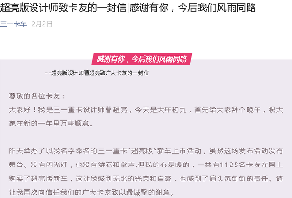 “中国不缺卡车,也不缺造卡车的企业,缺的是真正替卡友们着想的卡车和企业。”在今年2月初,三一重卡超亮版设计师曹超亮在《感谢有你,今后我们风雨同行-致卡友们的一封信》中如是说道,这样的话语让人动容,我们也相信,心里想什么,便会去做什么,三一若能一直秉承对人的关注,用不同的方式与手段不断传递“爱”,定能受到越来越多人的青睐。