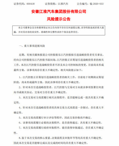 近期,有相关媒体报道公司控股股东江汽控股拟引进战略投资者有关事宜,经向公司控股股东江汽控股书面问询,江汽控股正在筹划引进战略投资者的相关工作,本次江汽控股引进战略投资者不涉及本公司控制权的变更,目前尚未形成最终方案,该事项尚存在重大不确定性,相关风险提示如下:
