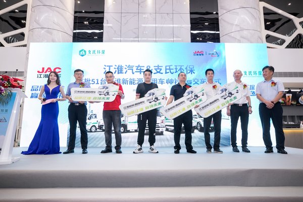 在隆重的仪式现场,安徽江淮汽车集团轻型商用车营销公司党委副书记华中应、深圳市支氏环保科技有限公司总经理支占利共同上台,为客户代表交付帅铃i5车辆钥匙。
