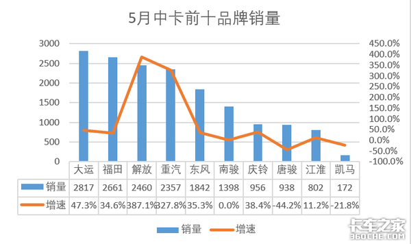 5月份中卡销售1.7万辆,同比增长69.9%;。其中前十企业销量中大运汽车已2817辆的销量居于榜首,而增速最为明显的为解放和重汽,分别实现387.1%和328.8%的增幅。唐骏和凯马销量下滑,下滑幅度为44.2%和21.8%。