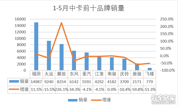 1-5月,中卡累计销售6.1万辆,同比下降2.4%。其中前十企业销量中仅有福田和解放实现销量上升,上升幅度分别为11.5%和226.6%。其余八家企业除南骏持平之外均实现销量下滑,唐骏和飞碟的下滑均超过50%。