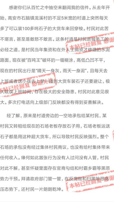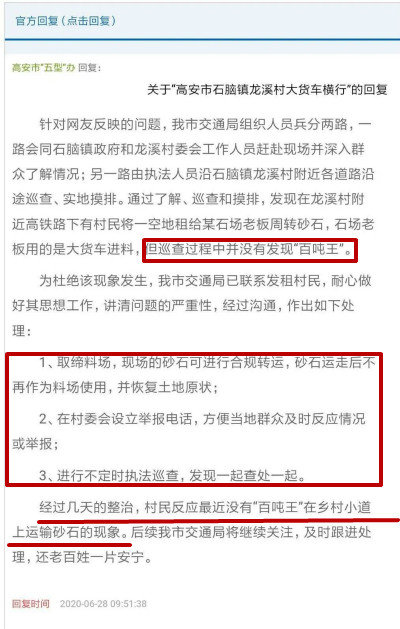 这封回复让人感到有意思的是,村民投诉村里经常有“百吨王”通行,当地执法人员说并没有发现,然而最后却又说经过几天治理,村民反映最近没有“百吨王”了,那村里此前到底有没有呢?