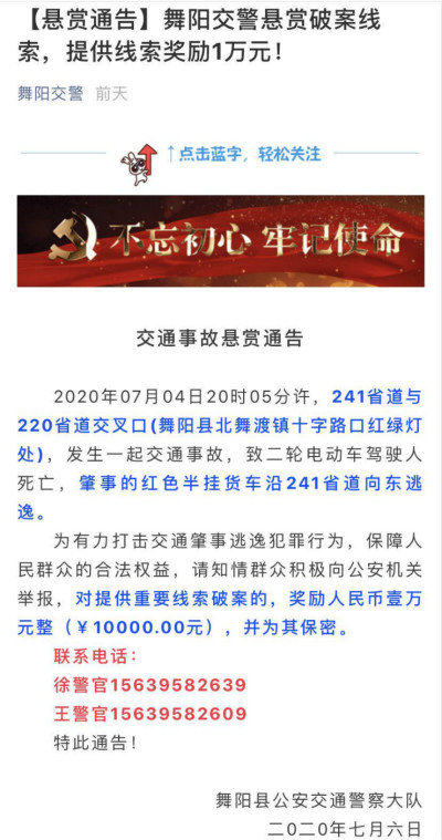 有线索的可以向警方提供消息,我们也希望肇事者能够自己主动投案自首,争取宽大处理。(文/高李敏 图/舞阳交警)