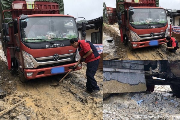条件艰苦,奥铃人机智来凑。由于客户拉的是一车玻璃制品,车身太重,加上泥泞的山路连日行车形成一条条沟壑,车的底盘恰恰卡在隆起的地面上。这种恶劣的救援条件让服务人员傻了眼,众人焦急之中,服务人员就地取材从附近的农家借来一枚铁锹,将车辆底盘处的泥土铲平后,又在附近找来木板垫在车的下方,维修师傅在泥泞中的狭小空间进行更换维修,经过40多分钟终于把车修好!