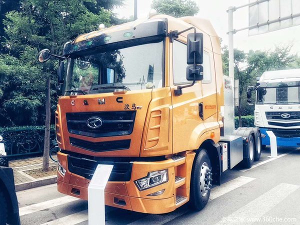 途中这台以华菱汉马H7为原型的电动牵引车便是在燃油车基础上进行动力重组的华菱纯电动牵引车,外观驾驶室部分不变,底盘和驾驶室后方为电池包。