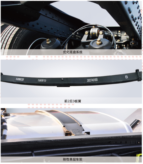 ※优化底盘,全面升级应用大量精铸件结构,减少车辆支架结构,降低自重,减少后期更换维修费用。※科学板簧,高效降重前2后3板簧经CAE应力分布校核分析和疲劳寿命试验,实现降重52kg。※全新搭配,更胜一筹全新V型推力杆,搭配轻量化平衡轴,承载不减,降重84kg。※刚性车架,平稳载物